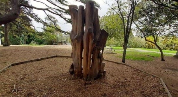 The northern fork of the trail continues between Ōtehā Stream and Lucas Creek until it crosses the former and enters Kell Park. Albert and Naomi Kells had owned a small orchard on this property until 1977, when they sold it to the Takapuna City Council for use as a park. The esplanade, meanwhile, had been acquired by the County of Waitemata for the same purpose in 1958. These were merged in 1984 to create Kell Park. Throughout the 1990s, the park was improved with the addition of a playground, pedestrian paths and boardwalks, and connections to adjacent parks and reserves. A sculpture titled ‘Flax Trader’, made in memory of Daniel Clucas and the early flax industry, overlooks the park. Kell park had a large population of free-range Bantam chicken for over 30 years, however as Albany became increasingly urbanised, the chickens were increasingly unpopular, and became the victims of ongoing cruelty, and plans were made for their removal. The Albany Village Business Association was disappointed by the removal of the chickens as they had been seen as an attraction to the aread